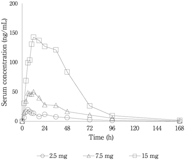 用量(mg) | Cmax(ng/mL) | AUClast(ng・h/mL) | tmax(h) | t1/2(h) |
