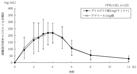 プロベネシド | 低血糖症状が起こることがある。 血糖値その他患者の状態を十分観察し、必要に応じて本剤又は併用薬剤の投与量を調節するなど慎重に投与すること。特にβ-遮断剤と併用する場合にはプロプラノロール等の非選択性薬剤は避けることが望ましい。 | 腎排泄抑制により血糖降下作用が増強される。 |